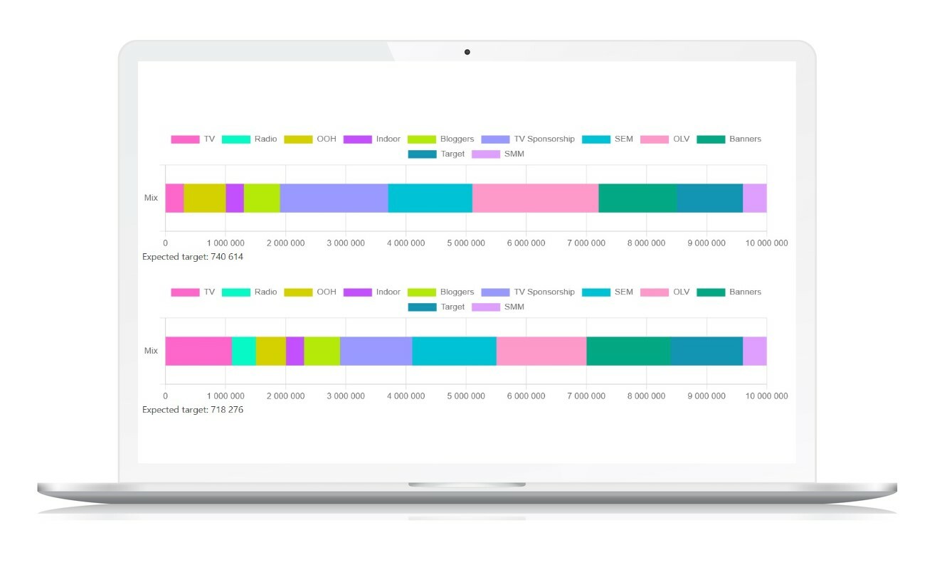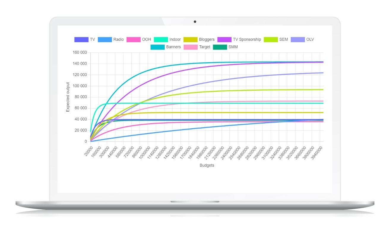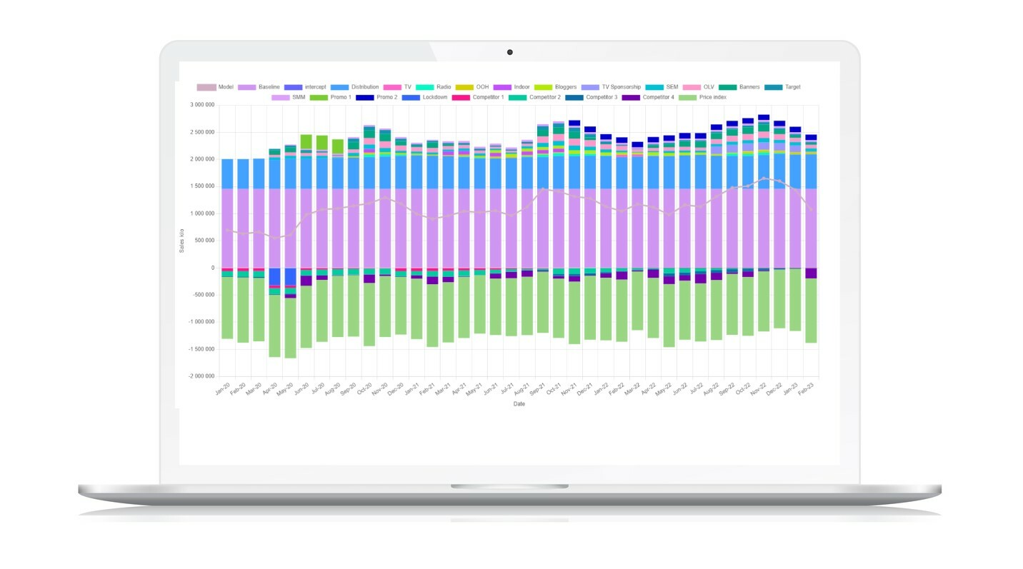 Modelling is based on the analysis of historical data. Econometrics helps to calculate what was the effectiveness of media and non-media performance. We analyse the results, optimise media mix and forecast sales in our scenario calculator